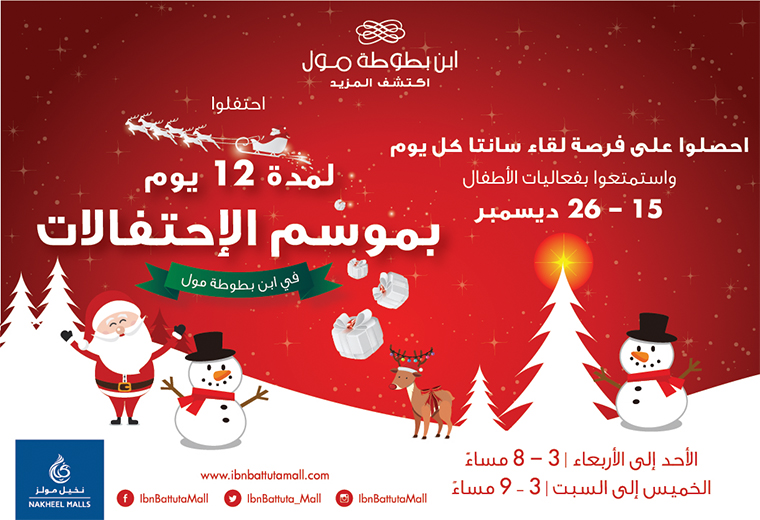 يعلن ابن بطوطة مول عن تنظيم العديد من الفعاليات المميزة لموسم العطلات في إطار الاحتفالات التي تمتد حتى 12 يوماً من المتعة العائلية.